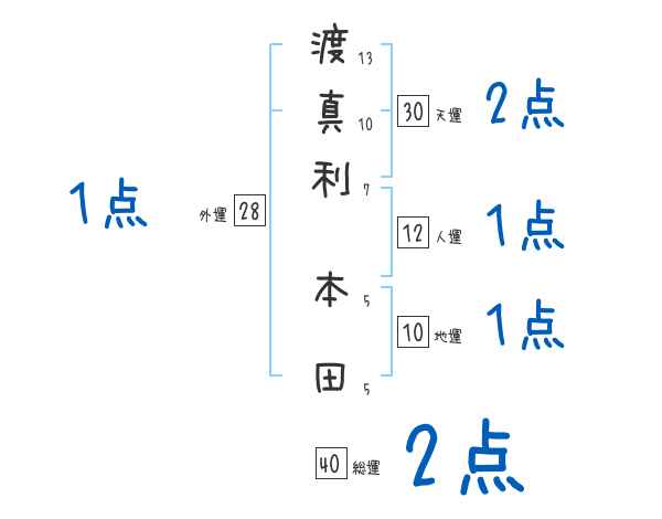 天運![]() | 渡真利本田さんの天運は30画の2つ星!浮き沈みの激しさに注意しましょう。 家系が持つ宿命的な運勢を表します。祖先から受け継いだ苗字ですので自分の力が及びません。家柄を象徴します。 |
