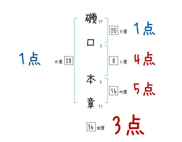 外運![]() | 磯口本章さんの外運は28画の1つ星!家庭環境に注意。スポーツで活躍できる能力があるかも。 生活面を象徴する運勢です。外部から受ける影響力を表し、結婚運、家庭運や職場、環境への順応性を表します。 |