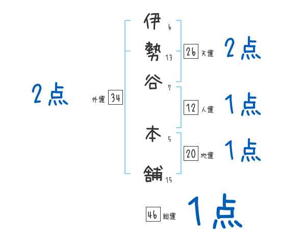 天運![]() | 伊勢谷本舗さんの天運は26画の2つ星!波瀾万丈かも。信頼できる人を大事にしましょう。 家系が持つ宿命的な運勢を表します。祖先から受け継いだ苗字ですので自分の力が及びません。家柄を象徴します。 |