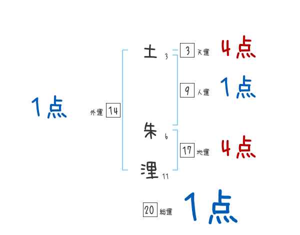外運![]() | 土朱浬さんの外運は14画の1つ星!人に対して優しいがストレスを溜め込みがち。人間関係のトラブルを避けるよう気をつけましょう。 生活面を象徴する運勢です。外部から受ける影響力を表し、結婚運、家庭運や職場、環境への順応性を表します。 |