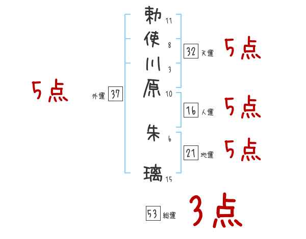 天運![]() | 勅使川原朱璃さんの天運は32画の5つ星!柔軟性があり成功する。チャンスが多く金運が良い。 家系が持つ宿命的な運勢を表します。祖先から受け継いだ苗字ですので自分の力が及びません。家柄を象徴します。 |