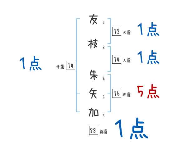 総運![]() | 友枝朱矢加さんの総運は28画の1つ星!家庭環境に注意。スポーツで活躍できる能力があるかも。 あなたの人生を表す1番重要な運勢です。生涯を通じて影響する総合運となり、主に50歳以降の晩年期に影響を及ぼします。 |