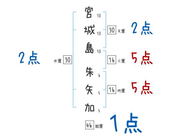 総運![]() | 宮城島朱矢加さんの総運は46画の1つ星!迷走することが多く苦労するかも。目先のことにとらわれないように。 あなたの人生を表す1番重要な運勢です。生涯を通じて影響する総合運となり、主に50歳以降の晩年期に影響を及ぼします。 |