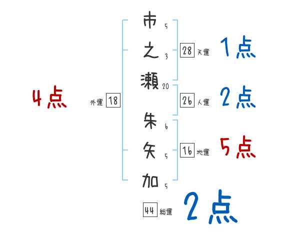 総運![]() | 市之瀬朱矢加さんの総運は44画の2つ星!誠実で慎重な性格。物事を考えすぎないように注意しましょう。 あなたの人生を表す1番重要な運勢です。生涯を通じて影響する総合運となり、主に50歳以降の晩年期に影響を及ぼします。 |