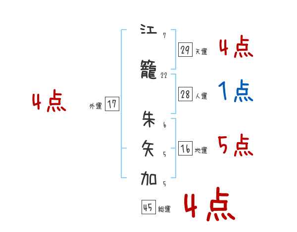 天運![]() | 江籠朱矢加さんの天運は29画の4つ星!完全主義で才能がある。厳格な心の持ち主。 家系が持つ宿命的な運勢を表します。祖先から受け継いだ苗字ですので自分の力が及びません。家柄を象徴します。 |