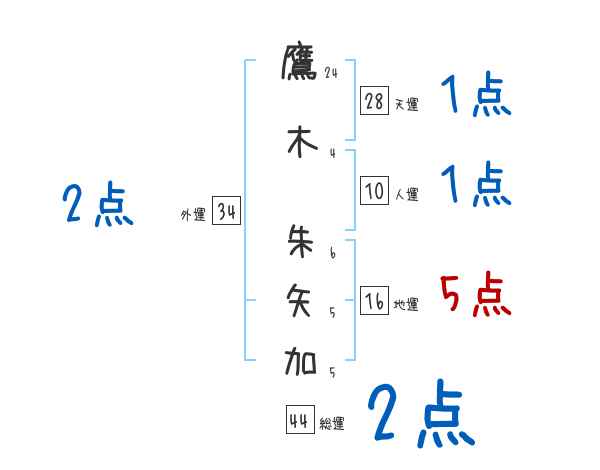 天運![]() | 鷹木朱矢加さんの天運は28画の1つ星!家庭環境に注意。スポーツで活躍できる能力があるかも。 家系が持つ宿命的な運勢を表します。祖先から受け継いだ苗字ですので自分の力が及びません。家柄を象徴します。 |