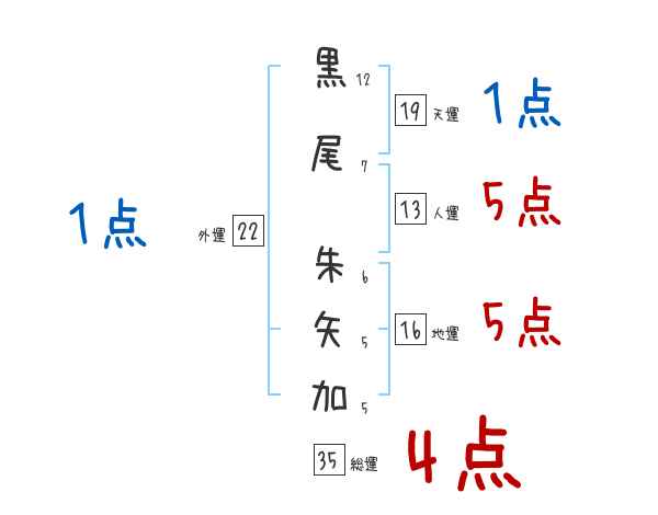 天運![]() | 黒尾朱矢加さんの天運は19画の1つ星!優れた才能を持ちますが、協調性が足りないことも。周りの人と協力する事を意識しましょう。 家系が持つ宿命的な運勢を表します。祖先から受け継いだ苗字ですので自分の力が及びません。家柄を象徴します。 |