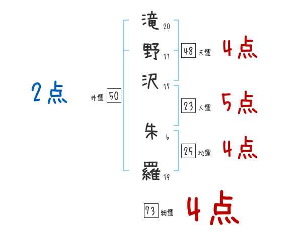 人運![]() | 滝野沢朱羅さんの人運は23画の5つ星!想像力に優れ活力がある。一代で成功し名誉を手に入れる。 性格や才能などを表す2番目に重要な運勢です。人間関係や協調性、社会的な成功に影響します。主に20歳から50歳ぐらいまでの中年期の運勢を表します。 |