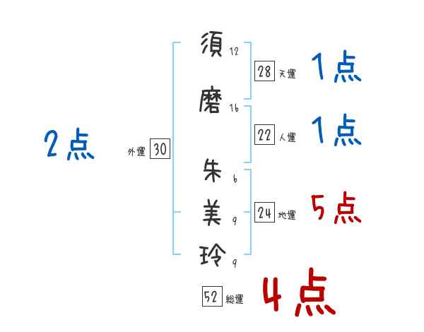 天運![]() | 須磨朱美玲さんの天運は28画の1つ星!家庭環境に注意。スポーツで活躍できる能力があるかも。 家系が持つ宿命的な運勢を表します。祖先から受け継いだ苗字ですので自分の力が及びません。家柄を象徴します。 |