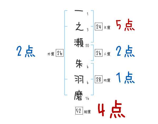 外運![]() | 一之瀬朱羽磨さんの外運は26画の2つ星!波瀾万丈かも。信頼できる人を大事にしましょう。 生活面を象徴する運勢です。外部から受ける影響力を表し、結婚運、家庭運や職場、環境への順応性を表します。 |