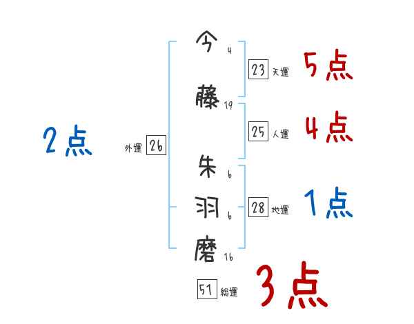 天運![]() | 今藤朱羽磨さんの天運は23画の5つ星!想像力に優れ活力がある。一代で成功し名誉を手に入れる。 家系が持つ宿命的な運勢を表します。祖先から受け継いだ苗字ですので自分の力が及びません。家柄を象徴します。 |