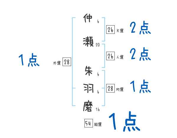 外運![]() | 仲瀬朱羽磨さんの外運は28画の1つ星!家庭環境に注意。スポーツで活躍できる能力があるかも。 生活面を象徴する運勢です。外部から受ける影響力を表し、結婚運、家庭運や職場、環境への順応性を表します。 |