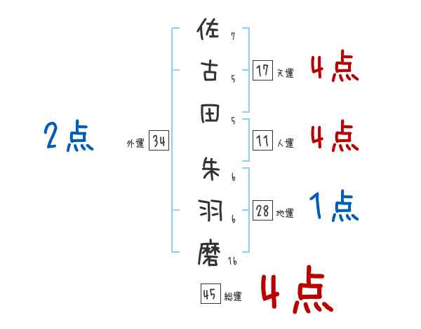 天運![]() | 佐古田朱羽磨さんの天運は17画の4つ星!積極的な行動力。地位を気づき財産を手に入れる。純粋な心と直感力。 家系が持つ宿命的な運勢を表します。祖先から受け継いだ苗字ですので自分の力が及びません。家柄を象徴します。 |
