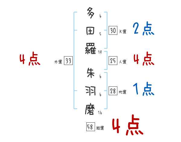 外運![]() | 多田羅朱羽磨さんの外運は33画の4つ星!権力志向でプライドが高い。勇気があり運を切り開き成功する。 生活面を象徴する運勢です。外部から受ける影響力を表し、結婚運、家庭運や職場、環境への順応性を表します。 |