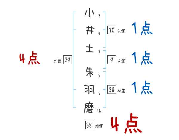 外運![]() | 小井土朱羽磨さんの外運は29画の4つ星!完全主義で才能がある。厳格な心の持ち主。 生活面を象徴する運勢です。外部から受ける影響力を表し、結婚運、家庭運や職場、環境への順応性を表します。 |