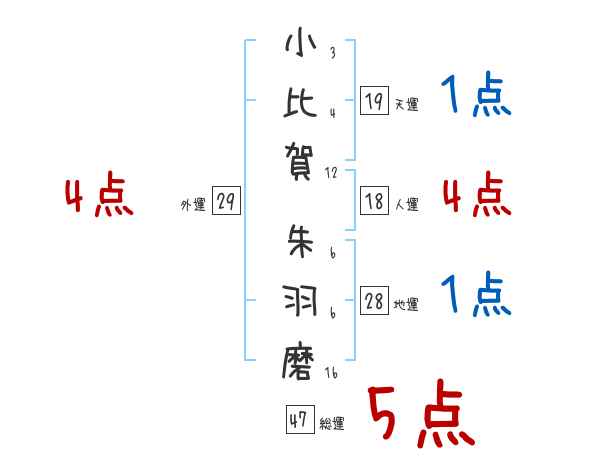外運![]() | 小比賀朱羽磨さんの外運は29画の4つ星!完全主義で才能がある。厳格な心の持ち主。 生活面を象徴する運勢です。外部から受ける影響力を表し、結婚運、家庭運や職場、環境への順応性を表します。 |