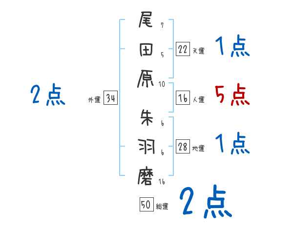 天運![]() | 尾田原朱羽磨さんの天運は22画の1つ星!努力することが苦手ないっぽう手先が器用。芸術性にも優れる。 家系が持つ宿命的な運勢を表します。祖先から受け継いだ苗字ですので自分の力が及びません。家柄を象徴します。 |