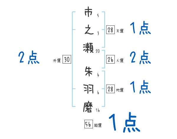 天運![]() | 市之瀬朱羽磨さんの天運は28画の1つ星!家庭環境に注意。スポーツで活躍できる能力があるかも。 家系が持つ宿命的な運勢を表します。祖先から受け継いだ苗字ですので自分の力が及びません。家柄を象徴します。 |