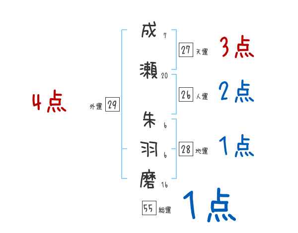 外運![]() | 成瀬朱羽磨さんの外運は29画の4つ星!完全主義で才能がある。厳格な心の持ち主。 生活面を象徴する運勢です。外部から受ける影響力を表し、結婚運、家庭運や職場、環境への順応性を表します。 |