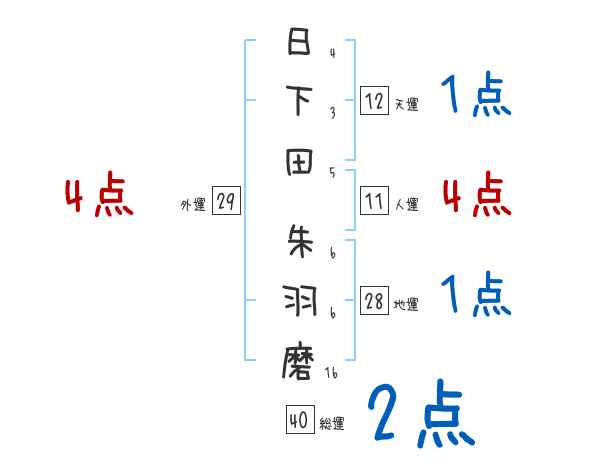天運![]() | 日下田朱羽磨さんの天運は12画の1つ星!簡単な失敗で諦めてしまいやすいかも。着実に行動すると良いでしょう。 家系が持つ宿命的な運勢を表します。祖先から受け継いだ苗字ですので自分の力が及びません。家柄を象徴します。 |