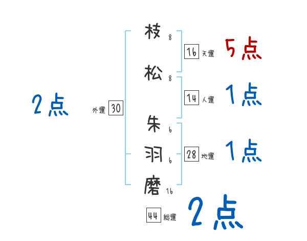 天運![]() | 枝松朱羽磨さんの天運は16画の5つ星!人望が厚く大きく発展する。逆転成功が見える。 家系が持つ宿命的な運勢を表します。祖先から受け継いだ苗字ですので自分の力が及びません。家柄を象徴します。 |