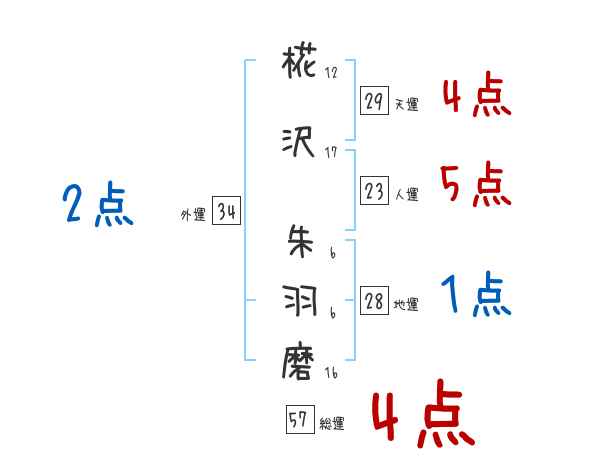 天運![]() | 椛沢朱羽磨さんの天運は29画の4つ星!完全主義で才能がある。厳格な心の持ち主。 家系が持つ宿命的な運勢を表します。祖先から受け継いだ苗字ですので自分の力が及びません。家柄を象徴します。 |