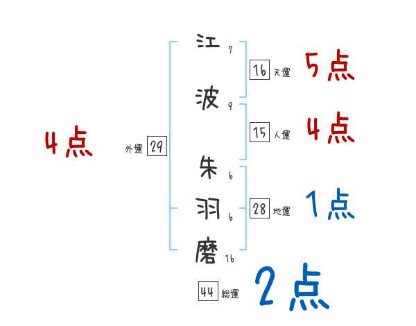 天運![]() | 江波朱羽磨さんの天運は16画の5つ星!人望が厚く大きく発展する。逆転成功が見える。 家系が持つ宿命的な運勢を表します。祖先から受け継いだ苗字ですので自分の力が及びません。家柄を象徴します。 |