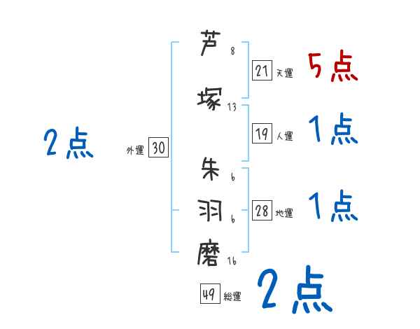 天運![]() | 芦塚朱羽磨さんの天運は21画の5つ星!統率力がある。独立し成功する。名誉を手に入れる。 家系が持つ宿命的な運勢を表します。祖先から受け継いだ苗字ですので自分の力が及びません。家柄を象徴します。 |