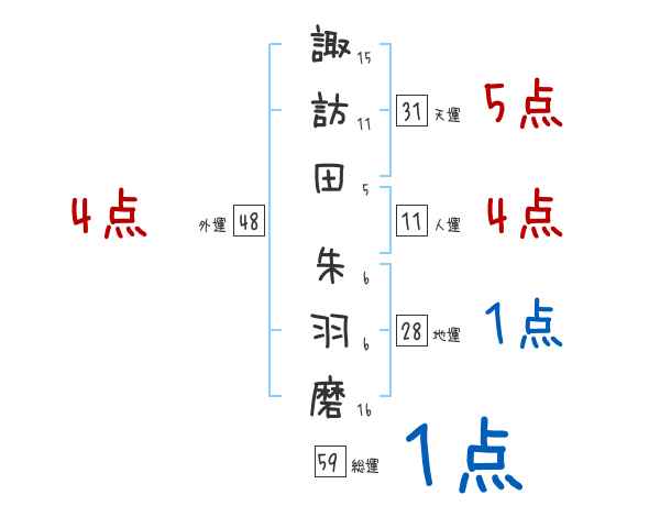 天運![]() | 諏訪田朱羽磨さんの天運は31画の5つ星!社交性があり判断力に優れる。順風満帆な人生で円満な生活。 家系が持つ宿命的な運勢を表します。祖先から受け継いだ苗字ですので自分の力が及びません。家柄を象徴します。 |