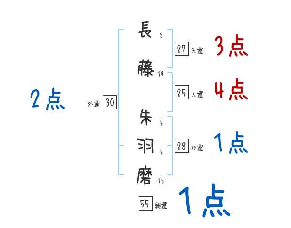 天運![]() | 長藤朱羽磨さんの天運は27画の3つ星!頭脳明晰だが強情で摩擦が多い傾向。孤立に注意。 家系が持つ宿命的な運勢を表します。祖先から受け継いだ苗字ですので自分の力が及びません。家柄を象徴します。 |