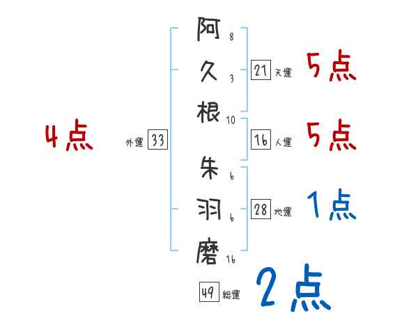 天運![]() | 阿久根朱羽磨さんの天運は21画の5つ星!統率力がある。独立し成功する。名誉を手に入れる。 家系が持つ宿命的な運勢を表します。祖先から受け継いだ苗字ですので自分の力が及びません。家柄を象徴します。 |