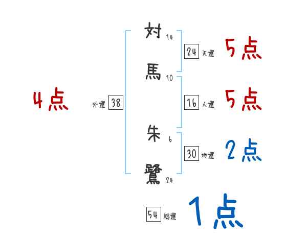 天運![]() | 対馬朱鷺さんの天運は24画の5つ星!家庭運が良く順調な人生。金運にも恵まれる。 家系が持つ宿命的な運勢を表します。祖先から受け継いだ苗字ですので自分の力が及びません。家柄を象徴します。 |