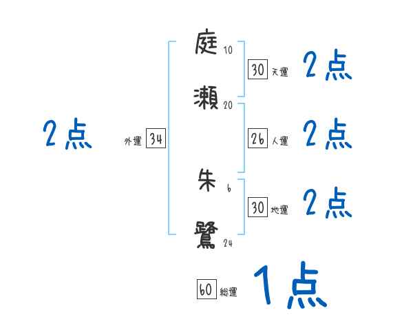 天運![]() | 庭瀬朱鷺さんの天運は30画の2つ星!浮き沈みの激しさに注意しましょう。 家系が持つ宿命的な運勢を表します。祖先から受け継いだ苗字ですので自分の力が及びません。家柄を象徴します。 |