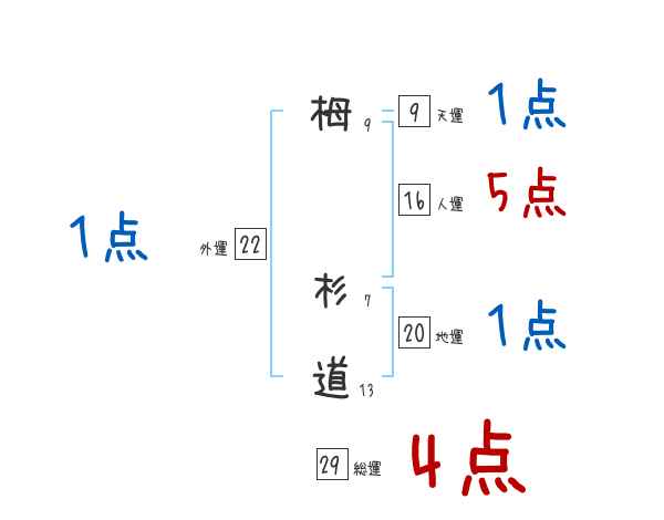 天運![]() | 栂杉道さんの天運は9画の1つ星!消極的で才能を発揮することが苦手なことも。周りの意見に耳を傾けましょう。 家系が持つ宿命的な運勢を表します。祖先から受け継いだ苗字ですので自分の力が及びません。家柄を象徴します。 |