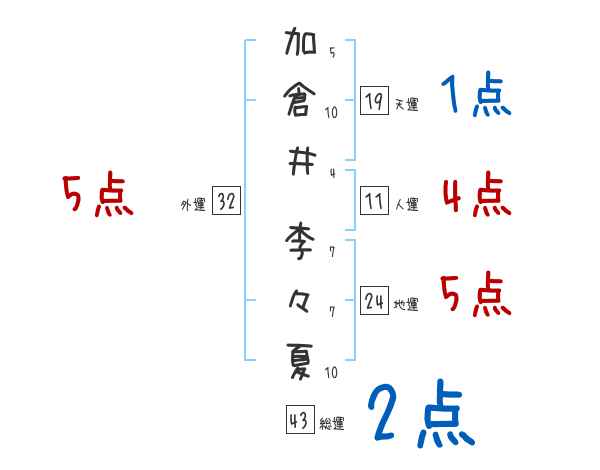 外運![]() | 加倉井李々夏さんの外運は32画の5つ星!柔軟性があり成功する。チャンスが多く金運が良い。 生活面を象徴する運勢です。外部から受ける影響力を表し、結婚運、家庭運や職場、環境への順応性を表します。 |