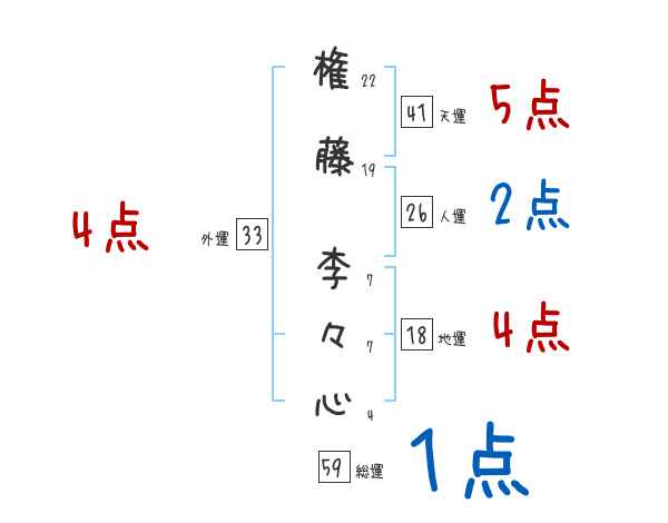 天運![]() | 権藤李々心さんの天運は41画の5つ星!大志を抱き、目標に向かって実力を発揮し達成する。温和な性格。 家系が持つ宿命的な運勢を表します。祖先から受け継いだ苗字ですので自分の力が及びません。家柄を象徴します。 |