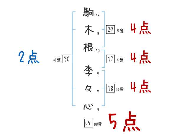 総運![]() | 駒木根李々心さんの総運は47画の5つ星!実力が開花し発展する円満な人生。財に恵まれる。 あなたの人生を表す1番重要な運勢です。生涯を通じて影響する総合運となり、主に50歳以降の晩年期に影響を及ぼします。 |