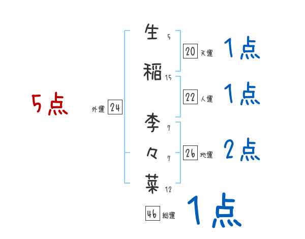 外運![]() | 生稲李々菜さんの外運は24画の5つ星!家庭運が良く順調な人生。金運にも恵まれる。 生活面を象徴する運勢です。外部から受ける影響力を表し、結婚運、家庭運や職場、環境への順応性を表します。 |