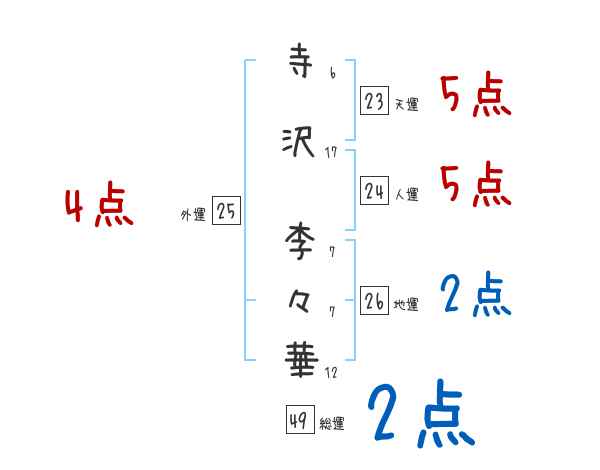 人運![]() | 寺沢李々華さんの人運は24画の5つ星!家庭運が良く順調な人生。金運にも恵まれる。 性格や才能などを表す2番目に重要な運勢です。人間関係や協調性、社会的な成功に影響します。主に20歳から50歳ぐらいまでの中年期の運勢を表します。 |