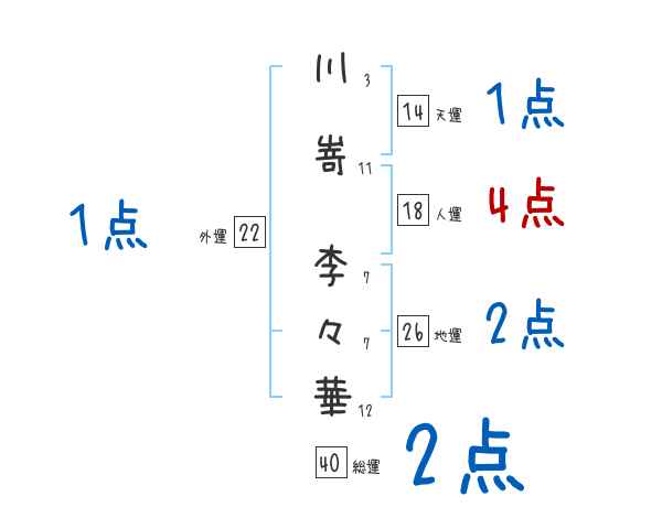 総運![]() | 川嵜李々華さんの総運は40画の2つ星!自信過剰で物事に固執するためトラブルに注意。 あなたの人生を表す1番重要な運勢です。生涯を通じて影響する総合運となり、主に50歳以降の晩年期に影響を及ぼします。 |