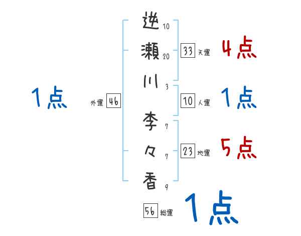 天運![]() | 逆瀬川李々香さんの天運は33画の4つ星!権力志向でプライドが高い。勇気があり運を切り開き成功する。 家系が持つ宿命的な運勢を表します。祖先から受け継いだ苗字ですので自分の力が及びません。家柄を象徴します。 |