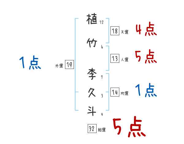 | 天運  | 植竹李久斗さんの天運は18画の4つ星!情熱的で剛気。忍耐力があり信頼される。家系が持つ宿命的な運勢を表します。祖先から受け継いだ苗字ですので自分の力が及びません。家柄を象徴します。 |