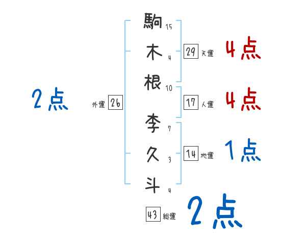 外運![]() | 駒木根李久斗さんの外運は26画の2つ星!波瀾万丈かも。信頼できる人を大事にしましょう。 生活面を象徴する運勢です。外部から受ける影響力を表し、結婚運、家庭運や職場、環境への順応性を表します。 |