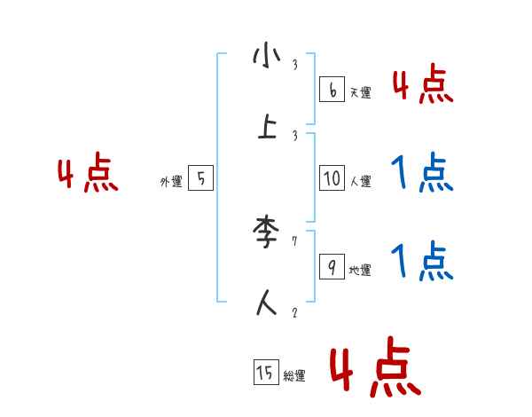 天運![]() | 小上李人さんの天運は6画の4つ星!慎重な努力家で信頼を得る。誠実な精神で向上心に優れる。 家系が持つ宿命的な運勢を表します。祖先から受け継いだ苗字ですので自分の力が及びません。家柄を象徴します。 |