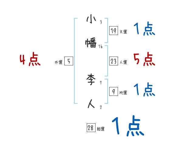 天運![]() | 小幡李人さんの天運は19画の1つ星!優れた才能を持ちますが、協調性が足りないことも。周りの人と協力する事を意識しましょう。 家系が持つ宿命的な運勢を表します。祖先から受け継いだ苗字ですので自分の力が及びません。家柄を象徴します。 |