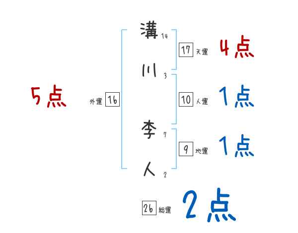 外運![]() | 溝川李人さんの外運は16画の5つ星!人望が厚く大きく発展する。逆転成功が見える。 生活面を象徴する運勢です。外部から受ける影響力を表し、結婚運、家庭運や職場、環境への順応性を表します。 |
