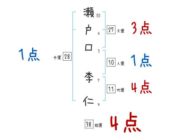 天運![]() | 瀬戸口李仁さんの天運は27画の3つ星!頭脳明晰だが強情で摩擦が多い傾向。孤立に注意。 家系が持つ宿命的な運勢を表します。祖先から受け継いだ苗字ですので自分の力が及びません。家柄を象徴します。 |