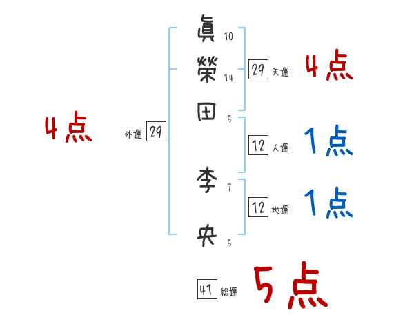 外運![]() | 眞榮田李央さんの外運は29画の4つ星!完全主義で才能がある。厳格な心の持ち主。 生活面を象徴する運勢です。外部から受ける影響力を表し、結婚運、家庭運や職場、環境への順応性を表します。 |