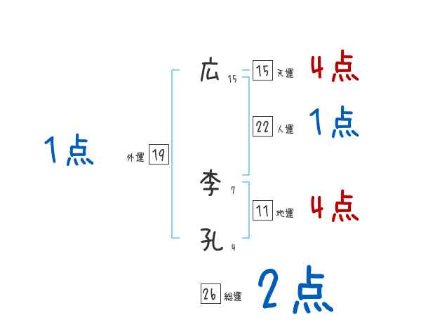 天運![]() | 広李孔さんの天運は15画の4つ星!人徳があり出世する。順調に物事を進め円満な人生。 家系が持つ宿命的な運勢を表します。祖先から受け継いだ苗字ですので自分の力が及びません。家柄を象徴します。 |