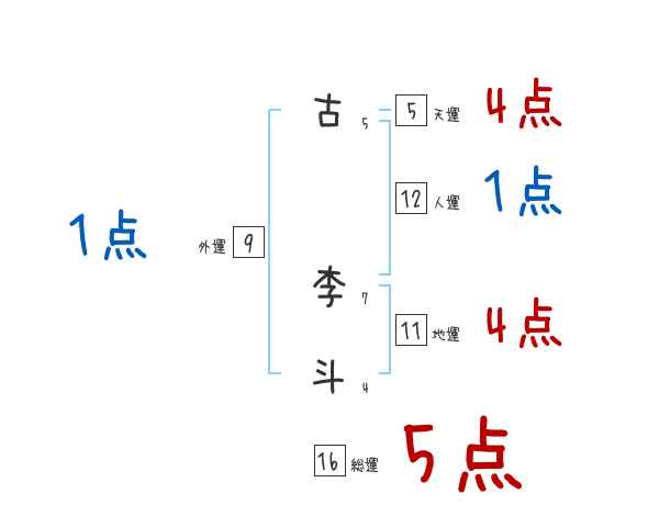 天運![]() | 古李斗さんの天運は5画の4つ星!健康で安泰。協調性に優れ、財産に恵まれる。 家系が持つ宿命的な運勢を表します。祖先から受け継いだ苗字ですので自分の力が及びません。家柄を象徴します。 |
